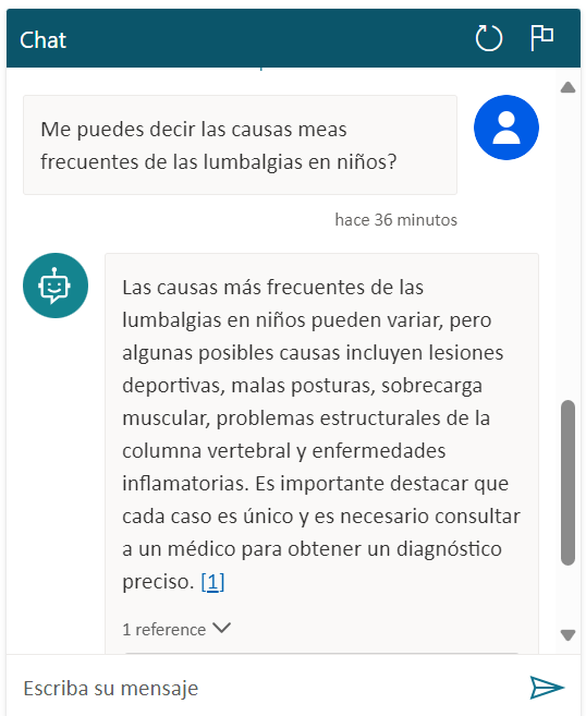 Finalmente, como prueba, hemos instruido a la IA Generativa de nuestro chatbot de diagnóstico de escoliosis con unos artículos (de libre acceso) sobre el tema, combinando la capacidad de diagnóstico de nuestro bot con otra didáctica o preventiva, igual de importante o más en el ámbito sanitario.